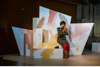 Die vier Akte des Stückes spielen in den Jahren 1963-68 in Venedig in Peggy Guggenheims Palazzo Venier dei Leoni, der heute als Museum und ständiger Ausstellungsort ihrer Sammlung dient. Rund wird diese Produktion durch das so einfache wie geniale Bühnenbild. Große schräg aufgestellte geometrische Formen bieten für die Videoinstallation eine phantasieanregende Kulisse.