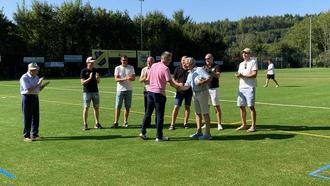 OB Hoffeld wünschte dem SV Merchingen mit seinen zahlreichen Aktiven- und Jugendmannschaften viel Freude mit und Erfolge auf dem neuen Platz. Er überreichte symbolisch für das gelungene Bauprojekt einen neuen Fußball an Ortsvorsteher Johannes Bies, mit welchem das Spiel zwischen den 1. Mannschaften SVM I und VfB Tünsdorf I ausgetragen wurde.