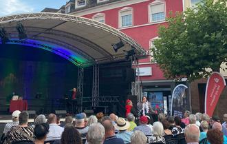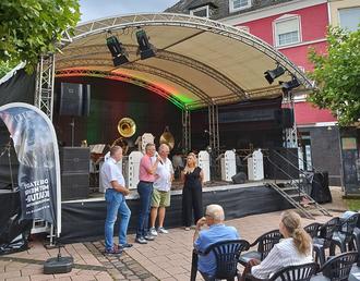 Andrea Zimmer, Leiterin des Kreiskulturzentrums „Villa Fuchs“, blickte auf einen schönen Kultursommer zurück, dessen Abschluss mit zwei weiteren Open-Air-Veranstaltungen gefeiert wird – dem Merziger Kinderfest am 25.08.2024 und einem unterhaltsamen Auftritt an der Kreuzbergkapelle mit Michael Friemel. Des Weiteren richtete sie ihren Dank an das saarländische Kultusministerium, das ebenfalls zur Ausrichtung von „Kultur am Kirchplatz“ beigetragen habe. Damit übergab Andrea Zimmer mit einem riesigen Applaus die Bühne an Klaus Huck und das neunköpfige Orchester.