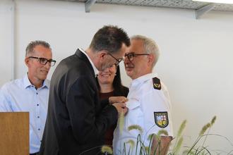 Ein besonderes Zeichen der Wertschätzung hatte Innenminister Reinhold Jost für den Kreisbrandmeister Ralf Bernardy im Gepäck. Der langjährige Wehrführer der Kreisstadt Merzig (und seit 1978 aktiver Feuerwehrmann) wurde mit der höchsten Auszeichnung geehrt, die man im Feuerwehrwesen erhalten kann: dem goldenden Feuerwehr-Ehrenzeichen als Steckkreuz.