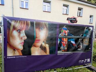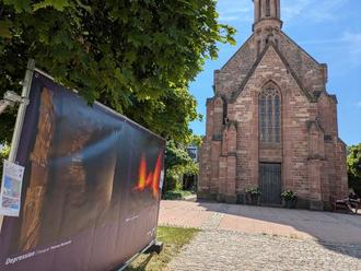 Vor der evangelischen Friedenskirche wurden die Besucherinnen und Besucher von zwei Plakatbannern begrüßt. Hier im Bild sehen Sie die Motive „Depression“ von Thomas Reinhardt und „Kraft“ von Konrad Funk.