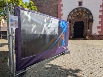 Vor der katholischen Kirche St. Peter wurden insgesamt drei Plakatbanner präsentiert, hier im Bild die Motive „Sinnkrise“ von Bodo Hoffmann und „Glauben“ von Christian Mütterthies.