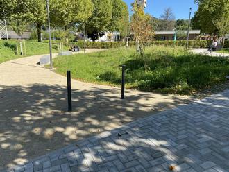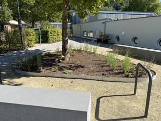 Durch die Absenkung eines Teilbereichs wurde eine Regenwasserretentionsmöglichkeit geschaffen, die das Stadtklima entlastet und einen Beitrag zur nachhaltigen Wasserbewirtschaftung leistet.