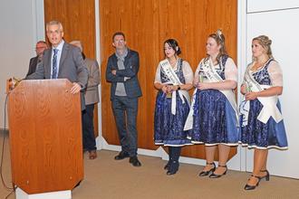 Traditionell begann das Viezfest mit einem Empfang der Ehrengäste im Großen Sitzungssaal des Merziger Rathauses, der von den Jagdhornbläsern Merzig begleitet wurde. Dabei konnte Bürgermeister Marcus Hoffeld zahlreiche Gäste willkommen heißen, darunter die Landtagsabgeordneten Frank Wagner, Martina Holzner und Stefan Thielen, Landrätin Daniela Schlegel-Friedrich sowie zahlreiche weitere Vertreter aus der Kommunalpolitik. Darüber hinaus begrüßte Hoffeld die Mitveranstalter des Viezfestes. So waren der Vertreter der Merziger Fruchtgetränke GmbH, Norbert Schramm, der Vorsitzende des Vereins für Handel und Gewerbe, Peter Schill, und der Vorsitzende des Viezfestorganisationsausschusses, Winfried Burger, vor Ort. Zum festen Bestandteil des Viezfestes gehört aber auch die Viezkönigin mit ihren Prinzessinnen. Der Bürgermeister freute sich daher, dass auch die diesjährige Viezkönigin Lea (Mahlberg) mit ihren Prinzessinnen Laila (Schwarz) und Jule (Dor) unter den Gästen weilte. Anwesend waren zudem Majorin Bohrmann vom Fallschirmjägerregiment 26, Weihbischof Robert Brahm vom Bistum Trier sowie die ehemaligen Protektoren Leo Petry (ehem. luxemburgischer Honorarkonsul für das Saarland), Jürgen Schreier (ehem. Minister für Bildung, Kultur und Wissenschaft) und Christian Weber (Generalbevollmächtigter der Karlsbergbrauerei) sowie die Repräsentanten aus der saarländischen Wirtschaft, wie die Sponsoren des Viezfestes Frank Jakobs und Wolfgang Fritz von der Sparkasse Merzig-Wadern, Prof. Edwin Kohl von kohlpharma, Jörg Loth von der IKK Südwest sowie Armin Streit von der Streit-Gruppe. Hoffeld bedankte sich zudem bei den Stadtwerken Merzig-Wadern, die das Viezfest ebenfalls finanziell unterstützen.