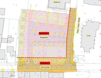 Der Bürgerplatz weist eine unzureichende Aufenthaltsqualität vor, ist aber der zentrale Ort für Veranstaltungen. Daher soll dieser zu einem einladenden Ortsmittelpunkt umgestaltet werden, der zum Verweilen einlädt. Maßgeblich trägt auch eine neue Oberflächengestaltung zu einer Verbesserung der Aufenthaltsqualität und des Mikroklimas bei, da der Anteil der versiegelten Fläche reduziert und die erhaltenswerte Baumsubstanz durch Neuanpflanzung ergänzt wird.