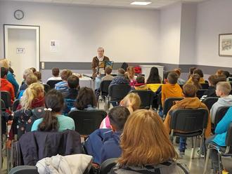 Kurzweilig erzählte er Geschichten aus seinem Buch „Ein Koffer voller Wunder“. Hier konnte er die Stilmittel aus seiner Theaterzeit einsetzen, z.B. Theaterdonner. Hier kamen auch eineTriangel, ein Küchenmörser, diverse Tüten, die er zum Platzen brachte und einiges mehr zum Einsatz. Seine Geschichten wurden mit Begeisterung aufgenommen und zwei Mädchen erzählten am Schluss noch ihre eigenen Kurzmärchen. Die Veranstaltungen wurden dankenswerterweise durch den Deutschen Literaturfond mit dem Projekt „Neustart Kultur“ gefördert.