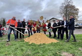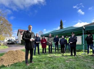Mit dem Spatenstich für die Kanalbaumaßnahme zum Anschluss des vorgesehenen Bauplatzes an das öffentliche Abwassersystem haben die Arbeiten zum Neubau des Feuerwehrgerätehauses und zur Erneuerung des Dorfplatzes im Stadtteil Brotdorf kürzlich begonnen.