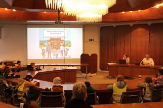 Bürgermeister Marcus Hoffeld begrüßte im großen Sitzungssaal die Gruppen und hieß alle Beteiligten herzlich willkommen. In einer kleinen Präsentation erklärte der Bürgermeister kindgerecht die Aufgaben einer Gemeinde und wie die Abläufe in einem Rathaus sind. Er forderte die Kinder dazu auf, ihre Meinungen und Verbesserungsideen zu äußern. Dabei gab es viele Vorschläge, beispielsweise die Spielplätze zu vergrößern oder Tiere im Kindergarten zu halten. Im Anschluss durften die Kinder ein Memorie, mit verschieden Motiven der Kreisstadt Merzig basteln und mit in den Kindergarten nehmen. Jedes Kind konnte sich im Büro des Bürgermeisters auf dessen „Chefsessel“ setzen und das Ganze wurde per Foto festgehalten. Zum Abschluss bekam jedes Kind ein kleines Pixie Buch passend mit dem Titel „Was macht meine Gemeinde?“. Die Kinder waren sichtlich begeistert und verabschiedeten sich stolz mit ihren selbst gebastelten Werken.