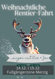 Auf dem Schlitten finden am 3. Adventwochenende (14./15. Dezember) zudem Mitsing-Konzerte statt. Mit an Bord sind die Musiker Eva Joris und Jan Lindemann, die die Fahrgäste mit Weihnachtsliedern begeistern. Zusammen mit allen Mitreisenden entsteht ein ganz besonderer Weihnachts-Chor, der durch Merzig schallt. Die Haltestelle für den Rentier-Schlitten befindet sich neben dem Stadthaus in Richtung Kirchplatz. Der Rentier-Schlitten fährt Montag bis Freitag von 17 - 19 Uhr und Samstag/Sonntag jeweils von 15-19 Uhr. Die Abfahrt findet ca. alle 15 Minuten statt. Der Preis beträgt 1 € pro Fahrt.