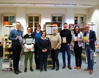Es war Martina Walbach und ihrem Team eine große Ehre, bei der ersten Abendveranstaltung im Jahr 2025 Oberbürgermeister Marcus Hoffeld, Bürgermeister Christian Bies und die Landtagsabgeordneten Martina Holzner und Frank Wagner begrüßen zu dürfen. Im Gepäck hatten die bekannten Persönlichkeiten nicht nur ihre Beglückwünschungen für das besondere Jubiläum der Stadtbibliothek, sondern auch einige ihre Lieblingsbücher. Marcus Hoffeld las aus „Ich bin dann mal weg“ von Harpe Kerkeling, Christian Bies hatte sich für „Die Möwe Jonathan" von Richard Bach entschieden. Martina Holzner stellte „Das Pubertier“ von Jan Weiler vor, während Frank Wagner Auszüge aus „Safari des Lebens“ von John Strelecky präsentierte. Die teils lustigen, aber auch philosophischen und nachdenklich-stimmenden Passagen boten ein abwechslungsreiches Erlebnis für die Zuschauerinnen und Zuschauer. Das Publikum nutzte ebenfalls die Möglichkeit, den Vorlesenden Fragen zu ihrer Bücherwahl und ihrem persönlichen Bezug zu stellen, seien es wiedergespiegelte Alltagserfahrungen mit Teenagern in der Familie, das erneute Lesen von Büchern in verschiedenen Lebensabschnitten oder literarische Denkanstöße für das eigene Leben.