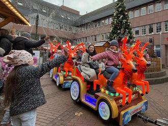 Den Anfang machten am Dienstag der vergangenen Woche die knapp 25 „Löwenkinder“ der Kita Schwemlingen, die beim köstlichen Waffelduft ein fröhliches „In der Weihnachtsbäckerei“ anstimmten. Ein munteres „Frohe Weihnachten!“ wünschten die ca. 25 Kinder aus Mondorf und von der Kita Seitert bei ihrer Fahrt am Mittwochvormittag. Und die fast 30-köpfige Gruppe aus Merchingen und Besseringen zeigte sich am Donnerstagvormittag besonders begeistert von der großen Krippe am Brunnen im Rathaus-Innenhof.