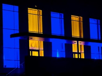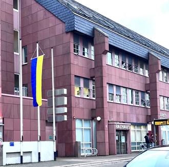 Auch die Kreisstadt Merzig steht fest an der Seite der Menschen aus der Ukraine. Als sichtbares Zeichen wehte vor dem Neuen Rathaus und der Stadthalle am vergangenen Freitag die ukrainische Flagge. Zum Jahrestag des Überfalls auf die Ukraine wurde als zusätzliches Zeichen die Stadthalle Merzig an den Tagen Freitag und Samstag in den Farben blau und gelb beleuchtet.