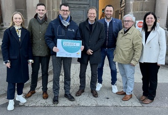 Freuten sich gemeinsam über die Förderung: v.l.n.r.: Emily Vontz (MdB), Bürgermeister Daniel Kiefer, Innenminister Reinhold Jost, Dr. Peter Delwing (V&B), Pascal Marx (V&B), Heiner Thul (Ortsvorsteher), Martina Holzner (MdL)
