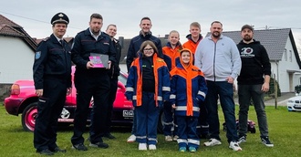 v.l.n.r.: Wehrführer Thomas Jager, Gemeindejugendwart Marcus Gnad, Konrad Prinz (Kraft Motorsport), Bürgermeister Daniel Kiefer, Mitglieder der Jugendfeuerwehr, Enzo Kraft und Devin Guillaume (beide Kraft Motorsport)