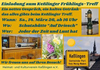 Der Heimat- und Kulturverein lädt herzlich zur diesjährigen Jahreshauptversammlung am Samstag, 14. März 2026 um 15.00 Uhr in die Schutzhütte Keßlingen ein. Im Anschluss, ab 16.00 Uhr beginnt der Keßlinger Frühlings-Treff, zu dem wir alle herzlich einladen. Beginnen Sie den Frühling in Keßlingen! Wir freuen uns auf Ihren Besuch!