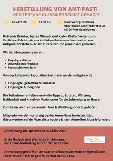 Am 24.03.2026 um 19:30 Uhr findet im Feuerwehrhaus Oberleuken ein Vortrag mit praktischer Zubereitung zum Thema „Antipasti selbst gemacht“ statt inklusive Verköstigung. Referentin ist Pasqualina Hartmann. Gemeinsam werden mediterrane Köstlichkeiten zubereitet und wertvolle Tipps zu Zutaten, Würzung, Haltbarkeit und Variationen gegeben. Passend dazu werden Rosé und Weißburgunder angeboten.
