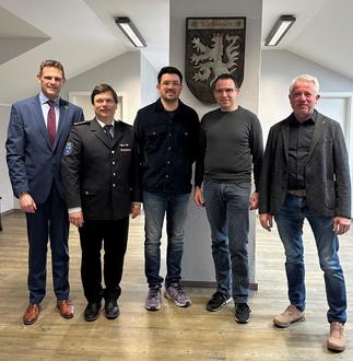 Foto v.l.n.r.: Bürgermeister Daniel Kiefer, Wehrführer Thomas Jager, stellvertretender Löschbezirksführer Phillip Görgen, Löschbezirksführer Stefan Kouba und Ortsvorsteher Stefan Ollinger