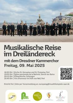 Anlässlich des 75. Europatags laden die Gemeinden Perl, Schengen und Sierck-les-Bains am Freitag, dem 09. Mai 2025 zu einer ganz besonderen musikalischen Reise durch das Herz Europas ein. Der renommierte Dresdner Kammerchor wird an einem Abend drei aufeinanderfolgende Konzerte im Dreiländereck geben.