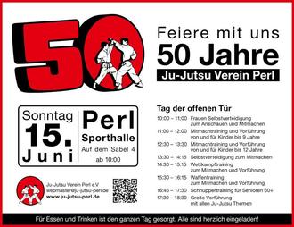Achtung: Am 15.06.2025 bietet sich die beste Gelegenheit, um unseren Sport kennenzulernen. Der Ju-Jutsu Verein Perl wird 50 Jahre alt und richtet eine 50 Jahrfeier aus. Am 15. Juni 2025 wird diese in und vor der Perler Turnhalle stattfinden. Für leibliches Wohl ist mit Getränke und Essensständen gesorgt und so lässt sich in entspannter Atmosphäre mehr über unseren Sport erfahren. Gezeigt werden Vorführungen unserer Mitglieder, bei dem man sich ein Bild über unseren Sport machen kann. Im Rahmen dieses „Tages der offenen Tür“ ist jeder Interessierte gerne zum mitmachen und ausprobieren eingeladen. Kommen Sie vorbei und schnuppern in verschiedene Bereiche unseres Trainings. Wir bieten Mitmachangebote für Kinder und Jugendliche, aber auch für Erwachsene aus allen Altersbereichen und auch spezielle Angebote für Frauen und Senioren. Es wird eine große Feier für Groß und Klein und wir freuen uns über jeden Besucher und jede Person auf der Matte. Alle Interessierten, Mitglieder und deren Angehörige sind herzlich dazu eingeladen ein paar spannende und entspannte Stunden mit uns zu verbringen.