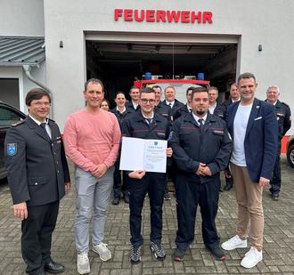 Foto v.l.n.r.: Wehrführer Thomas Jager, Ortsvorsteher Stefan Thielen, stellvertretender Löschbezirksführer Mike Wollmann, Löschbezirksführer Giuseppe Patti, Bürgermeister Daniel Kiefer
