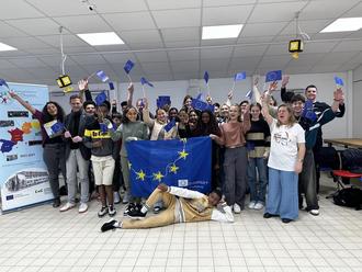 Bürgermeister Daniel Kiefer (links) und Schulleiter Georg Dillschneider (hinten) mit den Schülerinnen und Schülern der Gemeinschaftsschule (Klassenstufe 11) an der Saarschleife und ihre Austauschklasse des Collège Plateau Goyaves aus La Réunion mit Betreuungslehrerinnen: Claire Lavaud (links), Natalie Wiesmann (rechts) und Orsolia Hatvani (Mitte hinten).