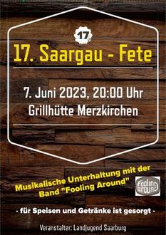 Am 07. Juni 2023 um 20.00 Uhr findet die 17. Saargau -Fete an der Grillhütte Merzkirchen statt. Musik mit der Band „Fooling Around“. Für Speisen und Getränke ist gesorgt. Eintritt 3 €.