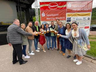 Gruppenbild - Von links nach rechts: Wolfgang Fritz, Laura Helm, und Pascal Miljevic (Sparkasse), Ulli Soumann (Saarschleifenland-Radio), Mettlacher Bierkönigin Anni, Anke Schorn (Abtei-Brauerei), Bürgermeister Daniel Kiefer, Felix Graf von Hardenberg, Frank Wagner (MdL, CDU), Orscholzer Erntekönigin Stephanie I., Orscholzer Ernteprinzessin Sophie