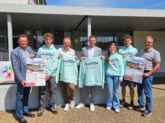 Foto: v.l.n.r. Wolfgang Kohn, Saarschleife Touristik; Silas Schuster (Teilnehmer), Georg Dillschneider, Schulleiter der Gemeinschaftsschule an der Saarschleife; Daniel Kiefer, Bürgermeister Gemeinde Mettlach; Michelle Kouba, (Teilnehmerin); Daniel Hoffeld, Sportlehrer; Klaus Klaeren, Europäische Sportakademie, Tour-Organisator.