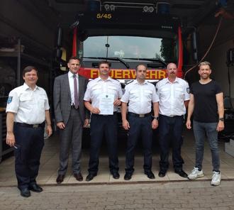 v.l.n.r.: Wehrführer Thomas Jager, Bürgermeister Daniel Kiefer, Löschbezirksführer Arno Bossel, Brandmeister Michael Reiland (stellvertretender Löschbezirksführer), Brandmeister Marcel Dillmann (stellvertretender Löschbezirksführer), Ortsvorsteher Jörg Hupperich