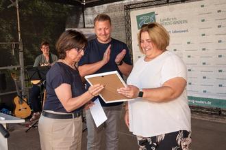Landrätin Daniela Schlegel-Friedrich überreicht Urkunde an Silke Brausch, hier mit Manuel Kerber, der als Ortsvorsteher den Vorschlag eingereicht hatte.