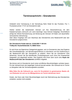 Es wird Ihnen als Eigentümer Gelegenheit gegeben, sich im Grenztermin über das Ergebnis des Grenzfeststellungs- und Abmarkungsverfahrens zu informieren und Ihre Zustimmung in der Niederschrift über den Grenztermin zu erklären. Wenn Sie am Grenztermin nicht teilnehmen, können die Sie betreffenden Flurstücksgrenzen auch ohne Ihre Anwesenheit festgestellt und abgemarkt werden. Das Ergebnis wird Ihnen dann durch eine Kopie der Niederschrift über den Grenztermin schriftlich mitgeteilt.