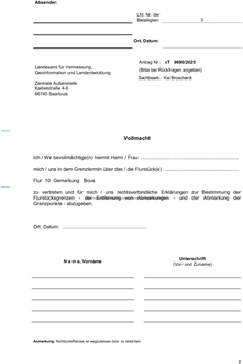 Sie können sich im Grenztermin durch einen schriftlichen Bevollmächtigten vertreten lassen. Für die Vollmacht kann der beigefügte Vordruck benutzt werden. Die Vollmacht ist im Termin zu übergeben oder der Vermessungsstelle zuzuleiten.
