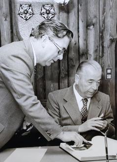 Der damalige saarländische Ministerpräsident Franz-Josef Röder gehörte zu den Ersten, die sich im Rathaus in das neue Goldene Buch der neuen Gemeinde Mettlach eintrugen. Robert Felten., von 1974 bis 1986 Bürgermeister, assistierte ihm dabei. Im Hintergrund ist auf dem Foto auch das von Ahnenforscher Reinhold Junges entworfene neue Wappen der Großgemeinde zu erkennen.