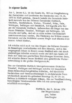 Auszug aus dem Mettlacher Amtsblättchen vom 02. Januar 1974