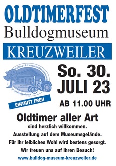 Am Sonntag, dem 30.07.2023 findet im Bulldogmuseum in Kreuzweiler ein Oldtimerfest statt.