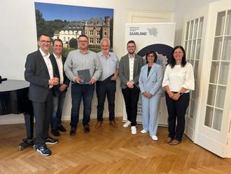 Foto v.l.n.r.: Innenminister Reinhold Jost, Landtagsabgeordneter Stefan Thielen, Markus Schreiner ehem. Ortsvorsteher in Weiten, Günter Leinen ehem. Stv. Ortsvorsteher in Mettlach, 3. Beigeordneter Gemeinde Mettlach Kim Tiedke, Landrätin Daniela Schlegel-Friedrich, Landtagsabgeordnete Martina Holzner