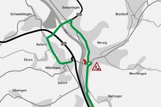 Für die Dauer der Einbahnregelung werden Verkehrsteilnehmer aus Merzig kommend in Richtung Hilbringen über die Hochwaldstraße und Brauerstraße, anschließend über die Trierer Straße auf die L 174 in Richtung Besseringen und Ballern umgeleitet.