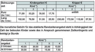 (1) In Abhängigkeit vom individuell vereinbarten Betreuungsangebot und der Betreuungszeit sowie der Kinderzahl einer Familie ist die monatliche Gebühr ab 01.08.2022 wie folgt festgesetzt: