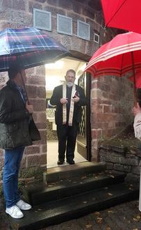 Trotz verregnetem Wetter fanden sich viele bekannte Gesichter zur feierlichen Übergabe an der Lutwinuskirche ein, darunter Luitwin Gisbert von Boch, Pfarrer Hans-Thomas Schmitt, Ursula Graf-Rummel (Vorsitzende des Lutwinuswerk Mettlach), Ortsvorsteher Heiner Thul, sowie Vertreter der beteiligten Unternehmen wie V & B oder die Firmen Hupperich, Laux & Meurers, Niggemann und BabaBau.