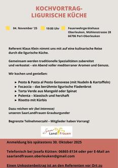Klaus Klein bringt Ligurien auf den Teller. Gemeinsam werden traditionelle Spezialitäten zubereitet und verkostet – ein Abend voller mediterraner Aromen Wir Kochen und Genießen: Pesto, Pasta al Pesto Genovese (mit Nudeln & Kartoffeln). Focaccia, – das berühmte ligurische Fladenbrot. Torta Verde, aus Mangold oder Spinat. Polenta, – klassisch und herzhaft. Risotto, mit Kürbis. Dazu reichen wir (bei Interesse) unseren „SaarLandFrauen Grauburgunder”.