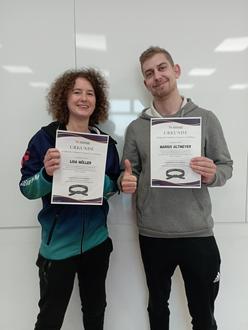 Damit nicht genug, erlangten 2 unserer Perler Trainer/innen am oben genannten Sonntag die Qualifikation zum Trainer C. Dazu besuchten Marius Altmeier und Lisa Müller zuvor an 5 Wochenenden Fortbildungskurse, in denen sie umfangreiches Wissen zum Trainingsaufbau erhielten, alle Techniken durchgingen und auf körperliche Besonderheiten in jedem Alter eingingen. Bestandteil der 120 Unterrichtsstunden war darüberhinaus das Notwehr-Recht, die Prävention sexualisierter Gewalt sowie die Kommunikation und das Feedback. Im Praxisteil wurden dann ebenfalls alle Wurf- und Hebeltechniken, Atemitechniken und Bodentechniken wiederholt und geübt.