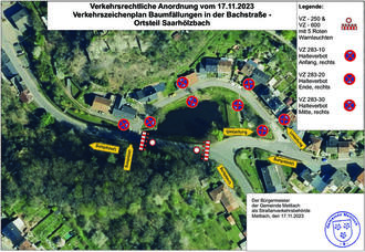 Anlässlich dringender Baumfällarbeiten erfolgt vom 22.11.2023 bis 23.11.2023 eine Vollsperrung im Ortsteil Saarhölzbach. Die Straße „Bachstraße“ wird in Höhe des Teichs voll gesperrt. Ein absolutes Halteverbot wird von der Hnr. 11 – 20 angeordnet, zusätzlich wird eine Umleitung ausgeschildert.