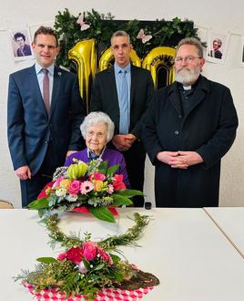Es gratulieren ganz herzlich v.l.n.r. Bürgermeister Daniel Kiefer, Ortsvorsteher Bernd Kettenhofen und Pastor Hans-Thomas Schmitt zum außergewöhnlichen Ehrentag von Cäcilia Grünewald