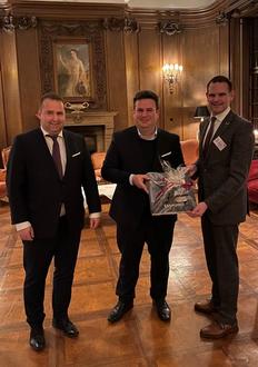 In Anwesenheit des saarländischen Arbeits- und Sozialministers, Dr. Magnus Jung, hat sich der Ehrengast aus Berlin im Anschluss an das Treffen ins Goldene Buch der Gemeinde Mettlach eingetragen und Bürgermeister Daniel Kiefer konnte als kleine Erinnerung an die Region das Text-/Bildband „Saarland-Industriekultur-Industrienatur – Ansichten-Bilder-Interpretationen“ samt einer Saarschleifen-Tasse von V&B überreichen.