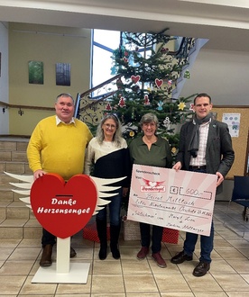 v.r.n.l.: Beiratsvorsitzender der Herzensengel „Beirat Mettlach“ Bürgermeister Daniel Kiefer, Bertina Nollmeyer, Margit Lion und Adrian Schmitz bei der Scheckübergabe im Rathaus Mettlach