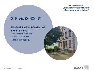 Der „Saarländische Bauernhaus-Wettbewerb“ feierte kürzlich seine 20. erfolgreiche Ausgabe, in der 11 Häuser gegeneinander antraten. Unter ihnen erstrahlte das sorgfältig renovierte Bauernhaus der Familie Becker-Schmidt aus Faha. Dieses Anwesen, seit Generationen in Familienbesitz, begeisterte die Landesjury mit seinem Charme und der liebevollen Sanierung. In der Abschlussveranstaltung am 30. November 2023 honorierte die Jury nun die Bemühungen der Familie mit einem geteilten zweiten Platz gemeinsam mit dem Ehepaar Zenner aus Merzig-Mechern. In Vertretung für Bürgermeister Daniel Kiefer gratulierte der Erste Beigeordnete der Gemeinde Rainer Borens der Familie Becker-Schmidt recht herzlich und lobte ihr Engagement für die stilvolle Restaurierung. Er betonte die Bedeutung solcher prachtvollen Gebäude für das Ortsbild.