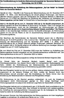 Gemäß § 2 Abs. 1 BauGB in der Fassung der Bekanntmachung vom 03. November 2017 (BGBI. I S. 3634), unter Berücksichtigung der aktuell gültigen Änderungen, wird hiermit öffentlich bekannt gemacht, dass der Gemeinderat der Gemeinde Mettlach in öffentlicher Sitzung am 12.12.2022 den Beschluss zur Einleitung des Verfahrens zur Aufstellung des Bebauungsplanes „Auf der Heide“ im Ortsteil Nohn im beschleunigten Verfahren gefasst hat.