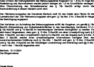 Der Beschluss des Gemeinderates der Gemeinde Mettlach ersetzt den in öffentlicher Sitzung am 16.12.2019 gemäß § 1 Abs. 3 und § 2 Abs. 1 BauGB i.V.m. § 13b BauGB in der Fassung der Bekanntmachung vom 03. November 2017 (BGBl. I S. 3634), unter Berücksichtigung der zu diesem Zeitpunkt gültigen Änderungen, gefassten Beschluss, da die Vorgaben des § 13b BauGB aufgrund der zeitlichen Befristung zum damaligen Zeitpunkt lediglich bis zum 31.12.2019 gültig waren.