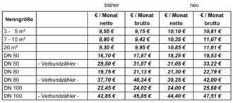 | 1.2.Gewerbetarif 1 für Gewerbekunden ohne EMAS / ISO 14001 – Zertifikat; einschließlich 13 Cent/m³ Grundwasserentnahmeentgelt | 2,42 | 2,59 |