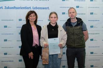 Foto: Landrätin Daniela Schlegel-Friedrich überreicht in Beisein des Moderators die Ehrenurkunde an Melissa Molnar © Florian Schiel
